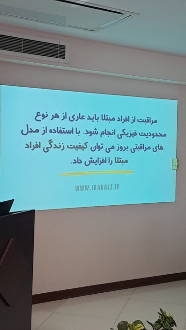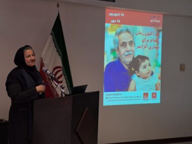 برنامه با پخش چند فیلم کوتاه با موضوع بیماری آلزایمر ادامه یافت سپس از سرکار خانم نیک رو معاونت محترم توانبخشی سازمان بهزیستی شهر تهران دعوت بعمل آمد به ایراد سخنرانی بپردازند و ایشان ضمن قدردانی از فعالیتهای انجمن به همکاری خوب انجمن با سازمان بهزیستی شهر تهران اشاره نمودند.